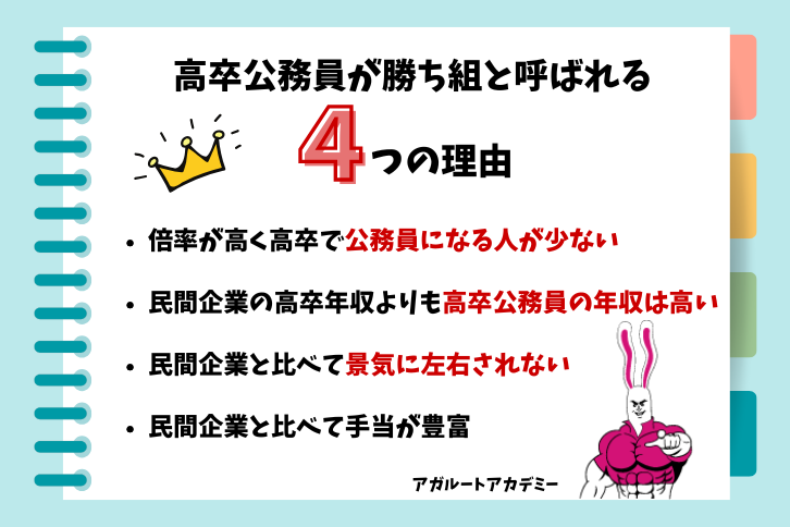 - 高卒公務員は倍率が高く、高卒公務員が少ないから
