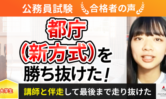 数ある公務員試験対策講座を検討する中で、①スケジュールの都合上、自分の好きなときに受けられるオンライン講座を希望していたこと、②オンライン講座でありながら添削や質問などの対応が充実しており、手厚いサポートが受けられること、③費用が安かったこと、④講座を無料体験した際、オンライン講義の視聴の使い勝手が良かったこと、⑤カリキュラムにより一通りの試験対策をできることから、アガルートを選択しました。