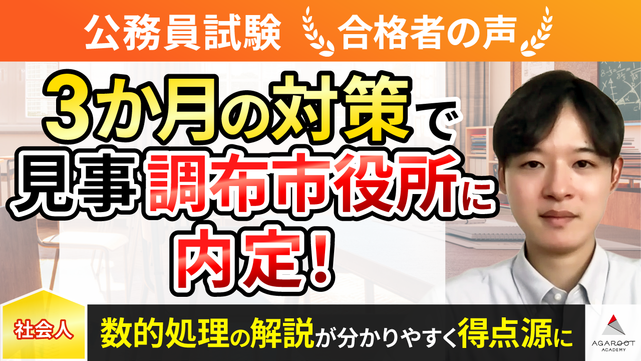 働きながらの勉強であったため、効率を重視することと隙間時間を活用して毎日少しでも勉強時間をとることを意識しました。東京都が第一志望であったため、アガルートの参考書以外に東京都Ⅰ類bの過去問を購入しました。数的処理が苦手だったので、数的処理の問題を中心に繰り返し解き、年明けから社会科学や専門試験等の暗記科目も勉強を進めました。基本的には参考書と過去問を解くことを繰り返し、わからない問題があれば動画を見ていました。また、動画を見ることで勉強にメリハリがつき、自分の勉強の進歩状況も可視化できました。東京都に標準を合わせていましたが、途中に模試を1回と特別区の試験を1回受験し、実践を積みながら自分の足りないところを補うように勉強計画を修正しました。