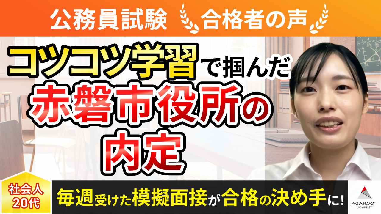独学で勉強を始めましたが、わからないところが多すぎて効率が悪いと思い、予備校に通おうと決めました。特に数的処理が全くできなかったので、対面での授業の方がわからないところを聞きやすいと思い別の予備校を検討していました。入学の説明を受けた時に、他の予備校を検討していますか?と聞かれ、検討していなかったのですが、そこでアガルートの存在を知りました。入学手続きを一旦保留し、予備校を比較したところ、勤務後移動時間や交通費を考え、オンラインの方が合っているのではないかと思い直しアガルートに決めました。入学相談のメールの返信が早く、わかりやすい説明だったことと電話での勧誘が一切なかったのも好印象でした。自分で学習習慣を作ることに関して不安はなかったため、オンラインの方が隙間時間を活用できたのでとてもよかったです。合格特典も魅力的で、合格特典があったからこそ辛い時も頑張ろうという気持ちで勉強ができました。