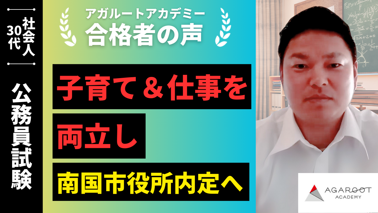 私は子供を3人持つ36歳の父親です。公務員試験を受験するために退職しました。金銭的な不安や今後の見通し等の不安もありましたが、公務員試験に挑戦してよかったと思います。学生時代には留年経験もあります。しかし、合格や成功をイメージし継続することが私自身重要だと感じました。リスクを負うことや変化することは怖いですが、挑戦して後悔するよりも挑戦せずに後悔する方が長引くように思います。一人一人個性があるように強みもあると思いますのでその強みをうまくアピールできるようになるためには経験が必要だと思います。アガルートを活用して合格された方はたくさんおられます。また特典も大変魅力的で、私自身も活用する大きな要因の一つになっています。