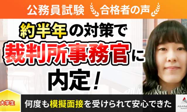 毎月の定期カウンセリングや面接対策では大変お世話になりました。周りに公務員の勉強をしている人がいない中、一人で勉強することは辛かったですが毎月定期カウンセリングで小林先生に「絶対大丈夫」と励ましていただいていたため、最後まで諦めずに頑張れました。面接対策では官庁訪問前日の模擬面接が上手くいかず、不安でいっぱいでしたが、「ありのままの自分でいけば絶対大丈夫、私が面接官やったらあなたを採用する」と励ましていただいたことがとても印象的でした。本番前もいただいた言葉を思い出して自分に自信をつけていました。その結果、受験したすべての試験で最終合格をいただくことができました。私が最後まで頑張れたのは小林先生のおかげです。アガルートを選んで良かったです。本当にありがとうございました!