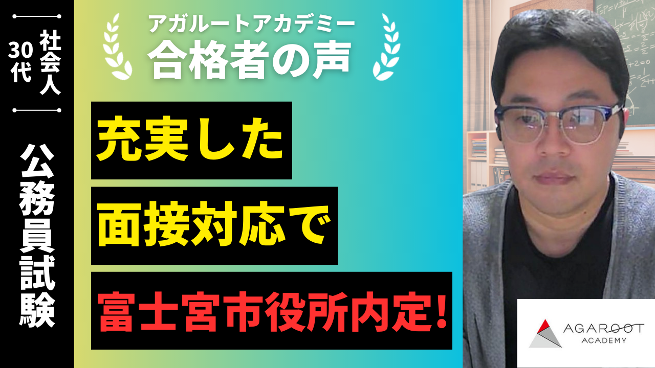 いわゆる従来式の教養試験ではなく適性検査だったのですが、まずアガルートさんのテキストを一読し、適性検査に関する概要を把握しました。その後は、市販のテキストを参考に、4冊を3周し、毎回のように回答に詰まってしまい知識として定着しない項目をノートに書き出し、それらを音読して録音しました。通勤中に録音を聞いて、ぶつぶつと音声を復唱しながら知識の底上げを図りました。人物試験対策としては、アガルートさんの模擬面接を最大限利用させてもらいました。YouTubeでご出演されていた様子を拝見して、是非小林先生を講師にお願いしたいと思っていたので、実際に小林先生のスケジュールで予約させていただくことができて良かったです。計3回と限られた機会ではありましたが、毎回的確なアドバイスをくださったので、1回目よりも2回目、2回目よりも3回目、そして3回目よりも試験当日と、自分自身でも習熟度の高まりを実感することができました。