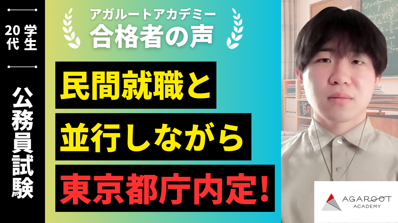 合格特典の制度に大きな魅力を感じたからです。親に経済的負担をかけず自分の力で就職活動を進めたいと考えていたため、合格すれば受講料が全額返金される制度はとても心強く感じました。また私は東京都庁専願であり、他の公務員試験を受験する予定がなかったため公務員試験対策にかかるコストはなるべく抑えたいと考えてもいました。さらに、当初は都庁の一般方式での受験を予定していましたが、民間企業の就職活動との両立が難しかったことや、筆記試験よりも面接試験の方が自分に適していると感じたことから、新方式での受験に変更しました。その際、アガルート様に新方式での合格でも合格特典が適用されるかを確認したところ、適用可能とのご回答をいただいたため、安心して受講を継続することができました。
