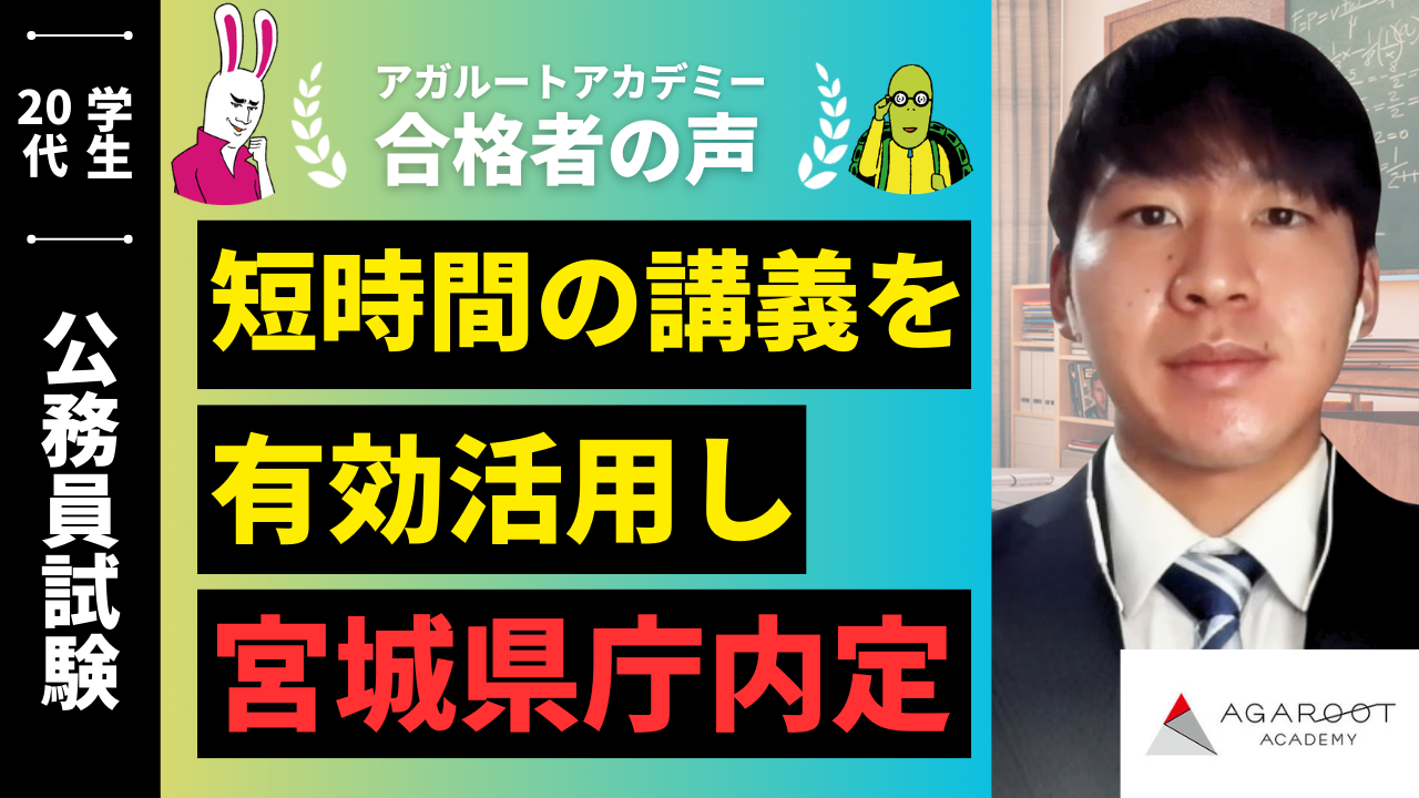 アガルートを選んだ理由は大きく分けて三つあります。一つ目は、近年CMなどで名前を耳にする機会が増え、合格実績が毎年上昇していることから、講義内容やフォロー体制が充実していると感じたことです。実際に面接練習や論文試験の添削を何度も受けられる点に魅力を感じました。二つ目は、オンライン型の予備校であったことです。大学の授業やアルバイトとの両立を考えると通学型の予備校は難しく、自分のペースで学習できる環境を求めていたため、アガルートの形式が最適だと感じました。三つ目は、合格特典として全額返金制度があることです。この制度は「必ず合格したい」というモチベーションにつながり、最後まで継続する大きな原動力となりました