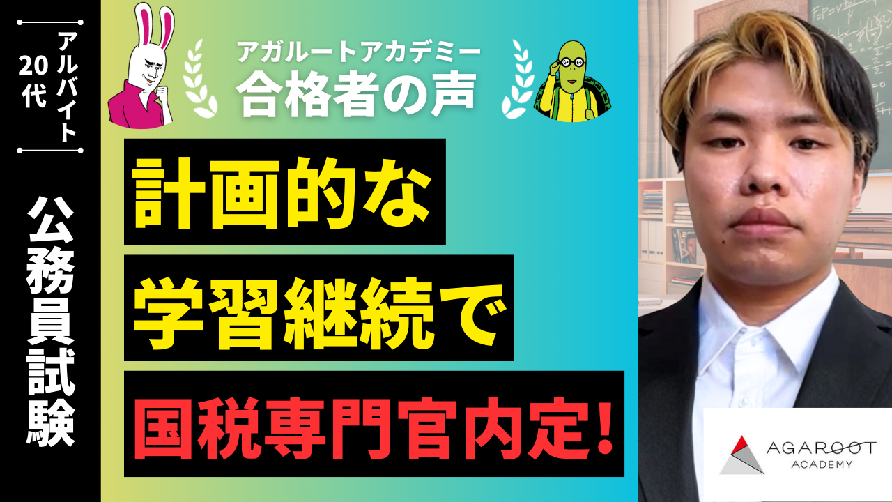 私は最初の4,5か月は独学で公務員対策をしていました。正直受かるだろうと思っていましたが、結果は一次試験不合格で内容も全然わかりませんでした。これはまずいと思い、すぐに予備校に入構したいと思い見つけたのがアガルートさんでした。高い合格率で受講者の学習状況に合わせた個別相談、さらには合格し内定をもらえたら受講料が全額返金される制度を設けている。また、当時は学生であり、予備校に通うことが難しかった中、アガルートさんはオンライン学習であったため、ここしかないと思い入構しました。やはり、長期間勉強を続けるにはそれなりのモチベーションの維持が必要です。入構料は決して安くはないということと、合格特典がもらえるということが受験に対するいいモチベーションの維持につながりましたし、結果的に合格できたのでアガルートさんを選んでよかったです。