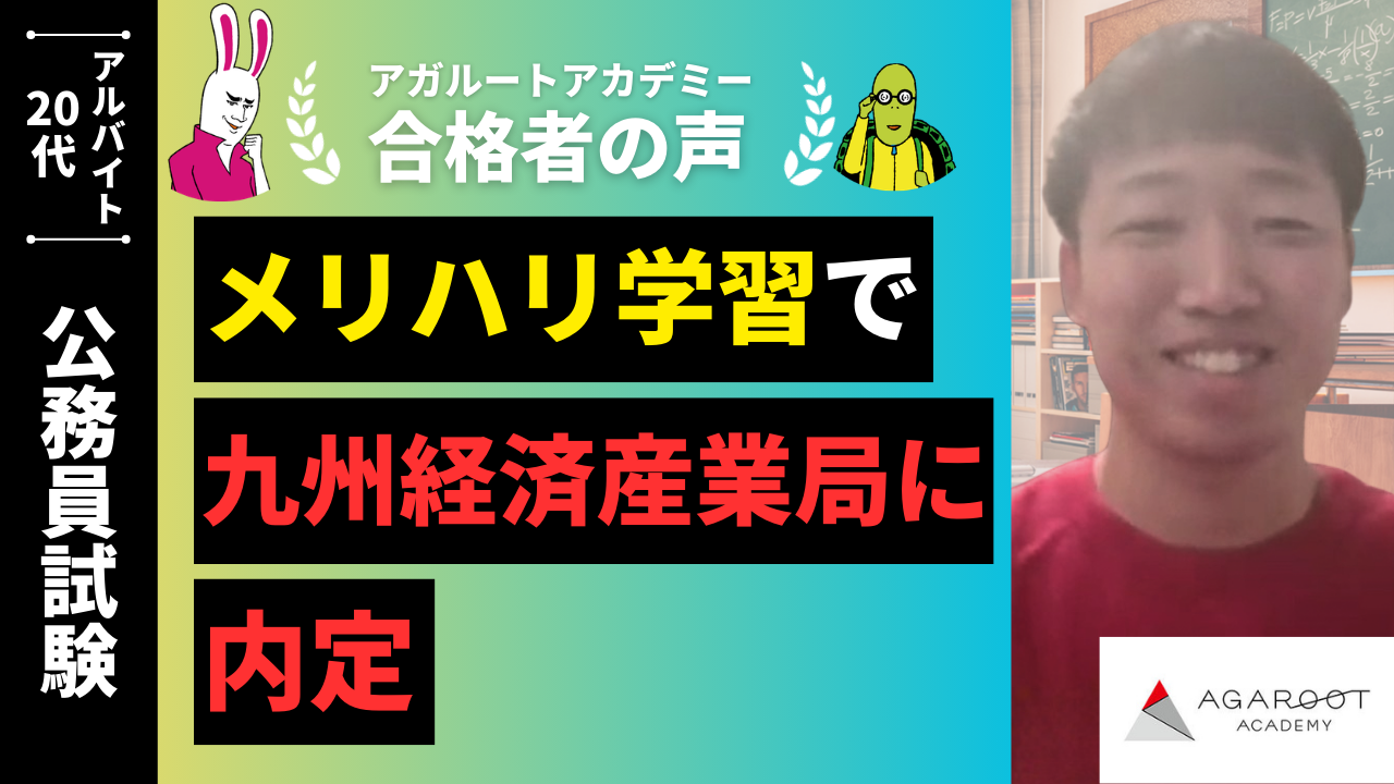 私がアガルートを選んだ理由は以前に公務員試験対策ではなく、別の資格勉強の際にも講座を利用させていただいた経験があるからです。その際に初めてアガルートの講義を受けたのですが、とても分かりやすく必要な内容が必要最低限に抑えられおり見事試験に合格することができた経験がアガルートを選ばせていただきました。また、講義の内容はもちろんのこと他の資格講義にくらべて価格が低く学生である私にとってはとてもありがたかったです。さらに私は公務員試験の対策を始めたのが一般的な受験生に比べて遅かったこともあり、教室で行われるような講義ではなく自身のペースでどんどん講義を進められるオンライン講義である点も私がアガルートを選んだ大きな理由です。