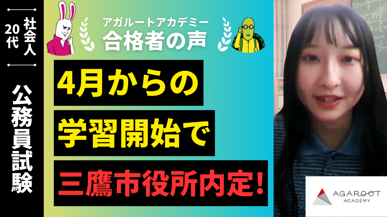 社会人のためオンラインではないと難しいと考えました。数多くのオンライン講座がありましたが、その中でもアガルートに決めた点は3点あります。まずは、1つの講座動画が短い点です。まとまった時間が取れる環境ではなかったため、効率よく取り組みたいと思っていました。そのため、短時間でも勉強が進められる点に魅力を感じました。2つ目は、面接対策です。回数制限なしという点は、面接が苦手だった点、また面接の配点が大きいともともと聞いていたので何度も取り組んでから試験に挑みたいと思っていました。3つ目は質問コーナーです。わからない点があっても質問を行えばしっかりと回答をもらえる点がいいと思いました。このような、効率の良さとフォロー体制が充実している点が決め手となりました。