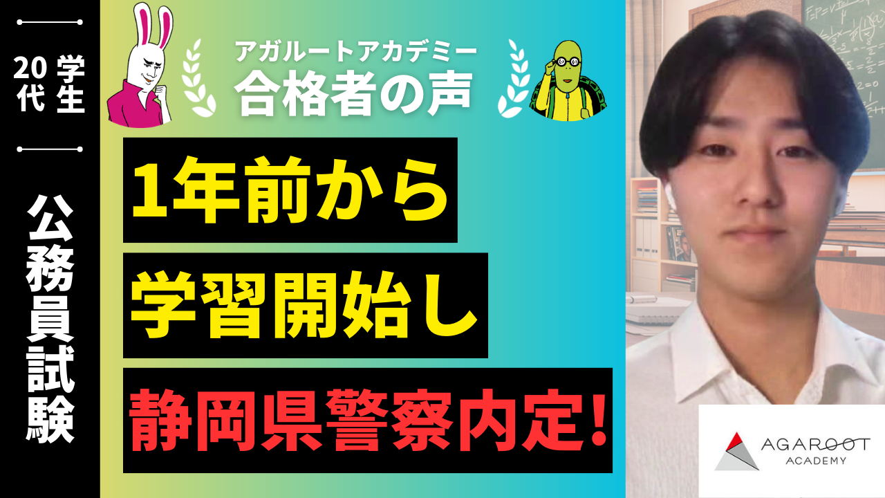 教養試験を受験した時の手応えはいつも以上にありました。静岡県警察では、社会科学に加えて、数的処理、判断推理、資料解釈の分野で配点が多いことが特徴でした。特に数的処理と判断推理に力を入れてきました。当日の問題は問題演習を行っていた問題よりも簡単であり、ほとんどの問題が1分以内で解くことが出来ました。これはアガルートで行ってきた多くの問題があり、全ての解き方が網羅できていたことが大きかったと考えています。半数以上の得点源である分野で解けた感覚があったので試験での手応えは良いものだったと考えています。