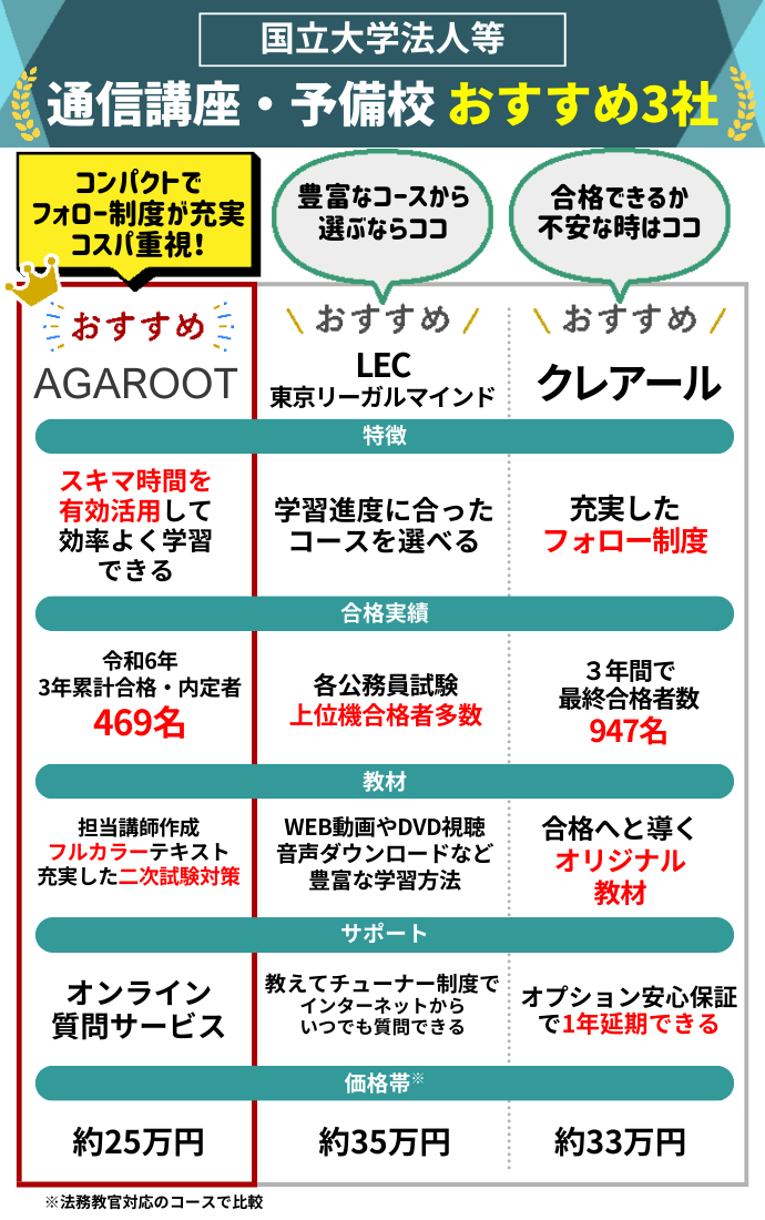 結論から言えば、国立大学法人等職員採用試験に合格したい人に特におすすめな公務員通信講座・予備校はアガルートアカデミーです。