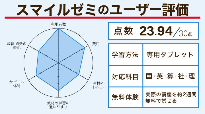 | スマイルゼミ | 28 | 14 | 8 | 0 | 0 | 4.40 |