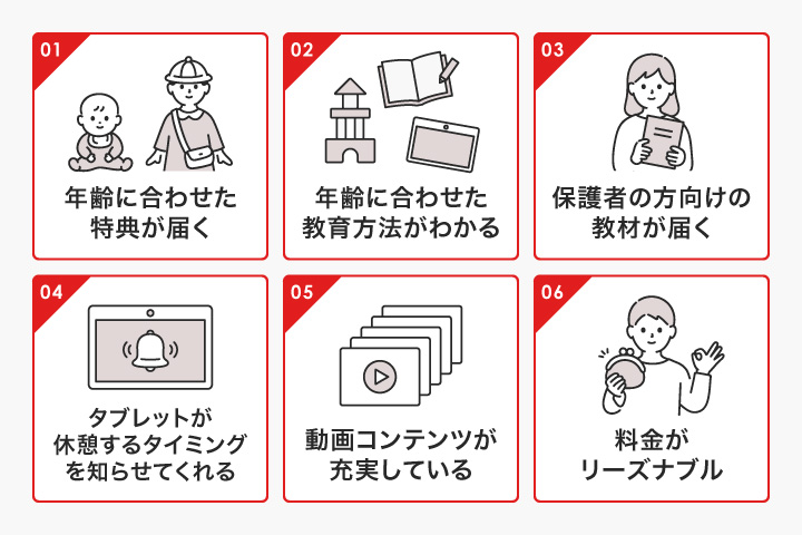 | 学習方法 | 絵本 / エデュトイ(知育玩具)/ 紙のテキスト / タブレット / 動画 など | タブレット など | 絵本 / おもちゃ / 紙のテキスト / 動画 など |