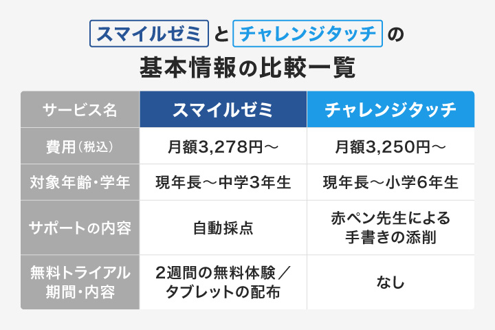 スマイルゼミとチャレンジタッチの基本情報の比較一覧