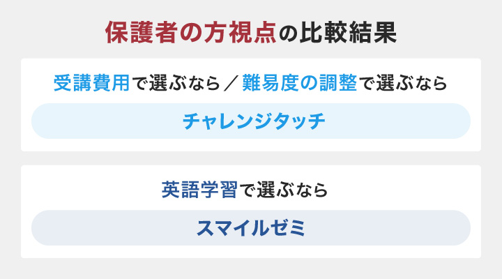 以上のことから、価格を重視して受講する通信教育を選ぶ際はチャレンジタッチがおすすめです。
