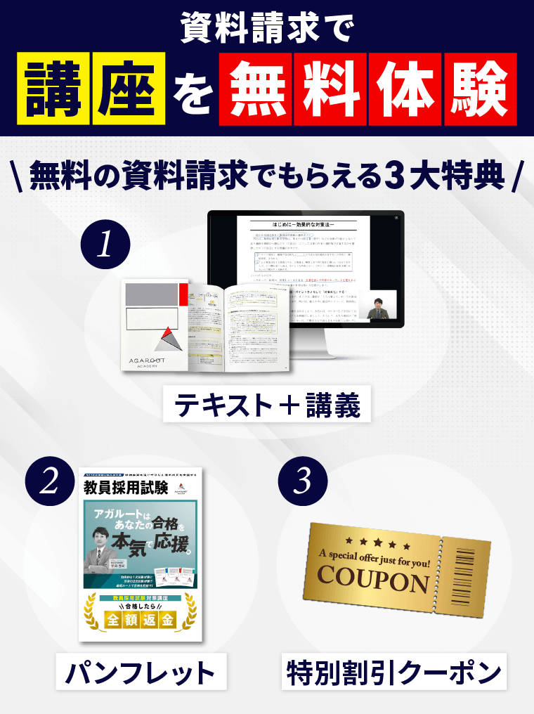 詳しい内容について知りたい方は、アガルートの教員採用試験対策講座をぜひチェックしてみてください。