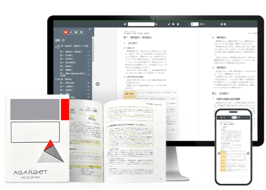 アガルートのカリキュラムはオンライン学習が中心となりますが、学習サポーター、オフィスアワー、オンライン自習室、合格ハンドブック、ホームルーム、オンライン添削、質問制度、といった双方向のサポートから、論文マンスリーゼミ、短答セルフチェックWebテストといった学習のペースメーカーまで、最後まで楽しく、緊張感を持って継続できるフォロー制度をご用意しています。