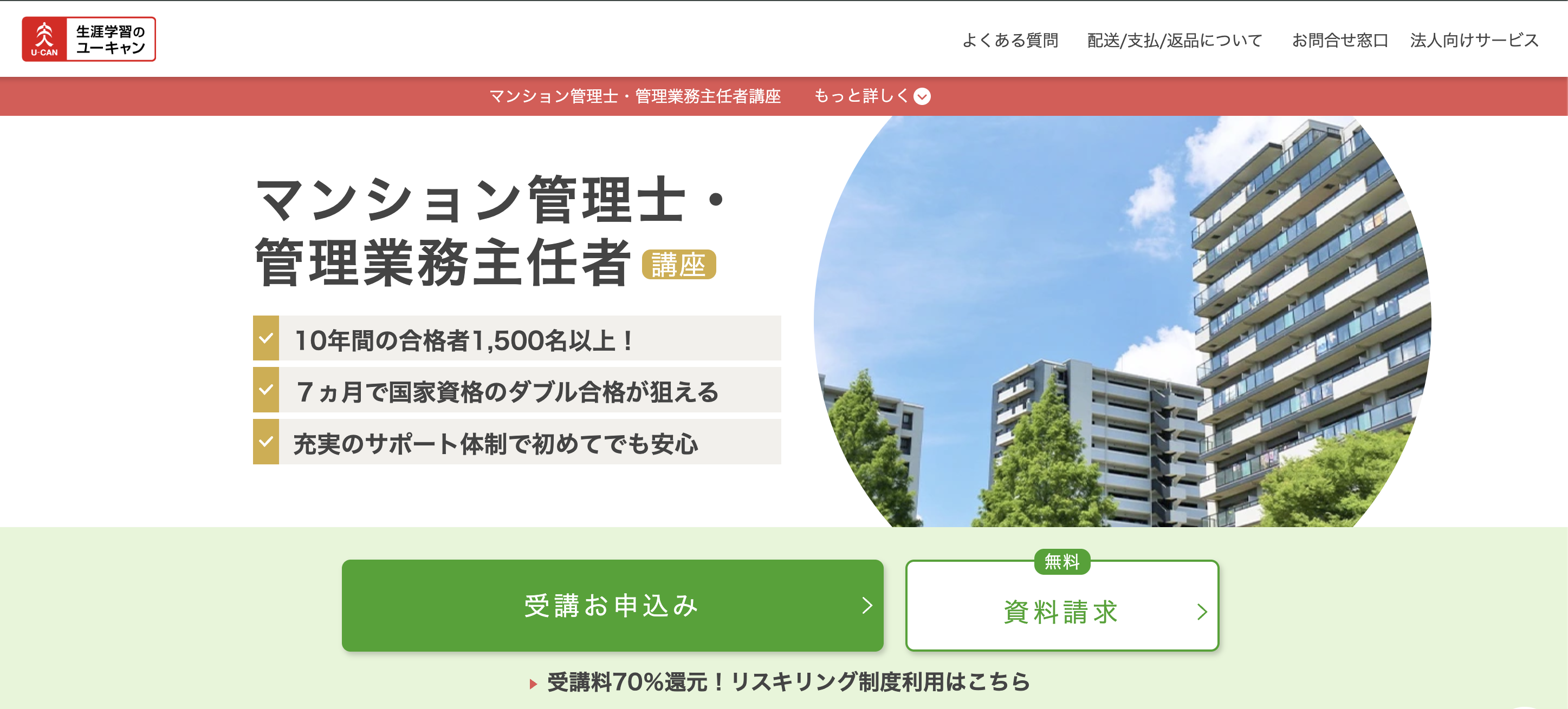 | ユーキャン | 69,000円~ | ・マンション管理士・管理業務主任者講座 | ・管業とセットのコース1つのみ ・イラストや図解を用いたわかりやすいテキスト | ・12回の添削指導 ・受講期間によっては翌年までサポート ・メールで質問可 |