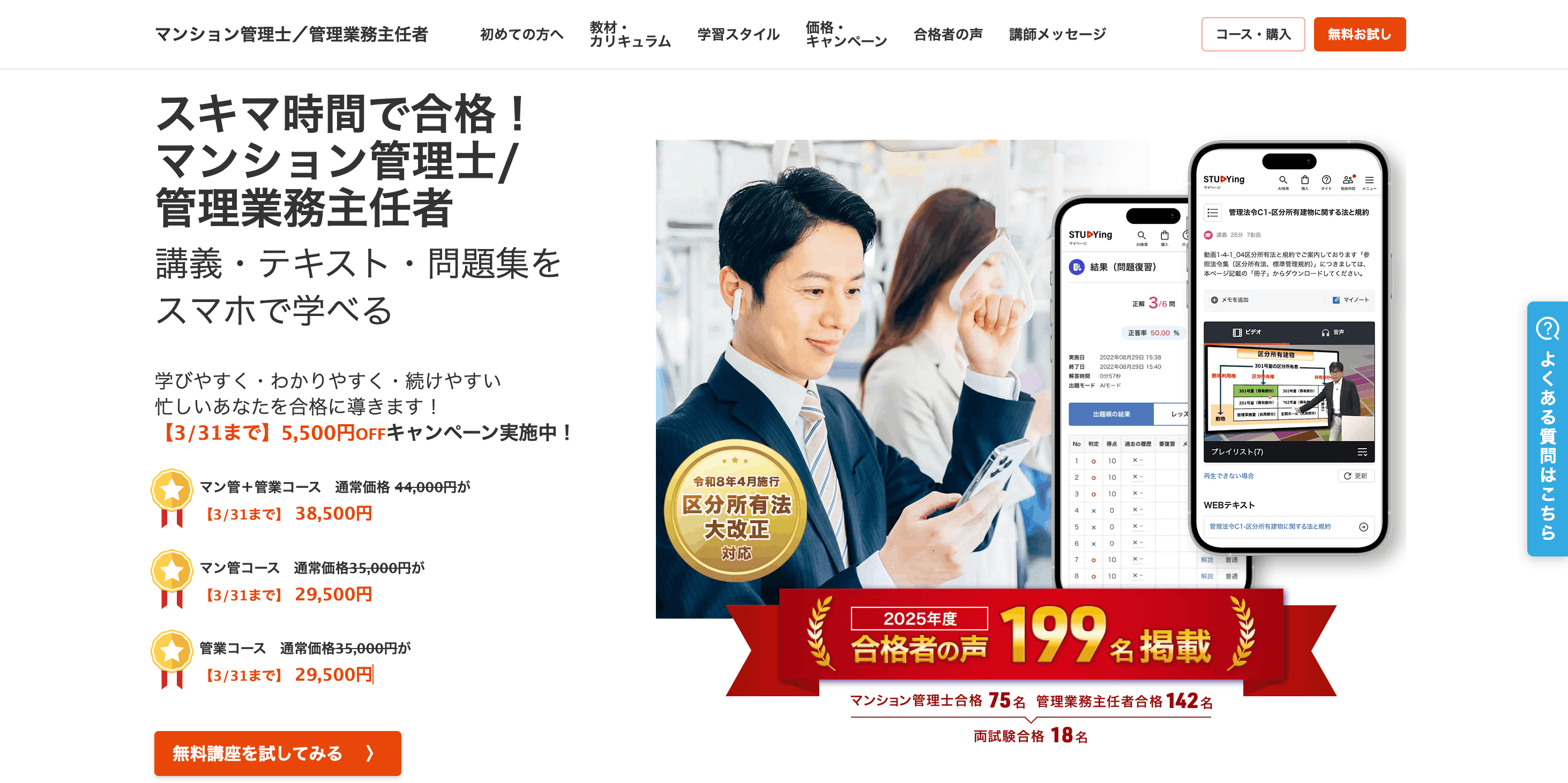 | スタディング | 35,000円~ | ・マンション管理士 合格コース ・マンション管理士/管理業務主任者 合格コース | ・低価格 ・紙なし、デジタルに特化したシステム | ・質問制度なし ・AIを活用した学習システム ・合格得点あり |