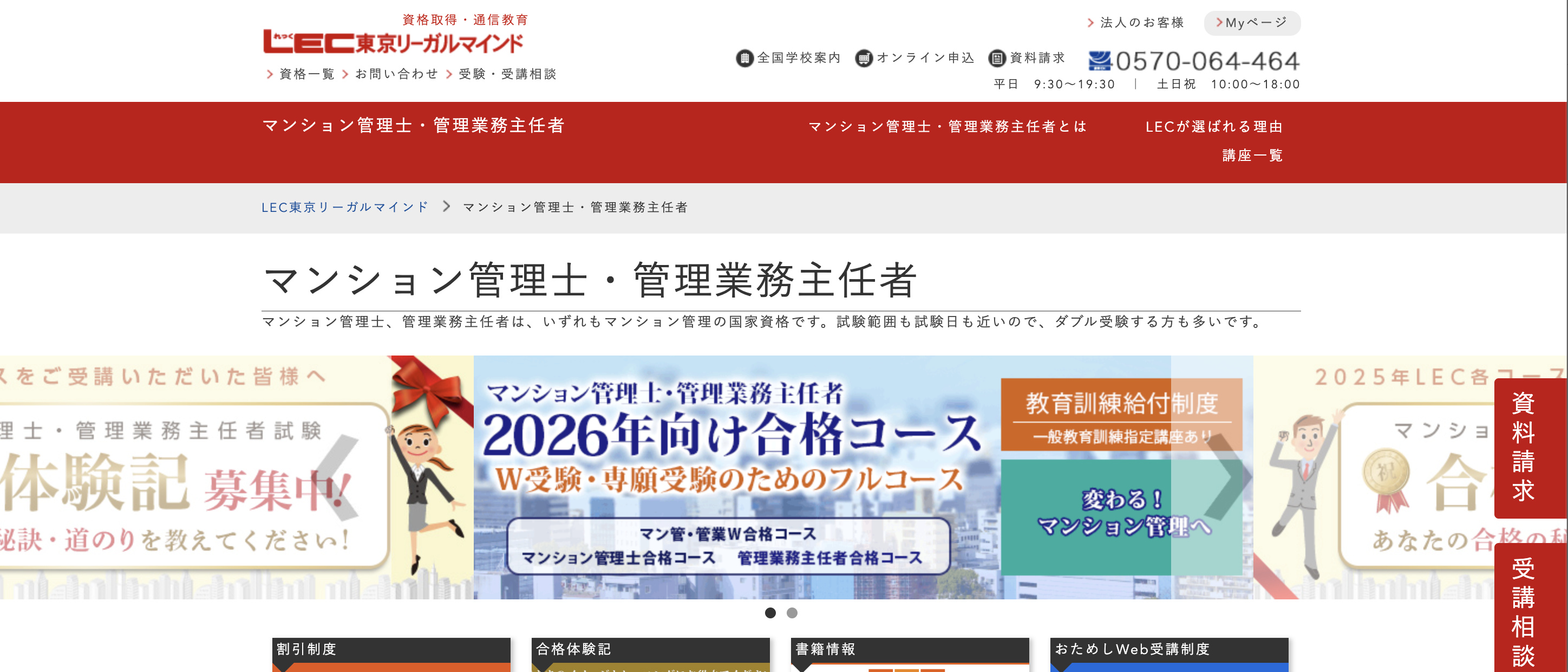 | LEC | 77,000円〜 | ・初級コース(マンション管理士/W合格コース) ・上級コース ・速習コース など | ・通信、通学のどちらにも対応 ・初学者~上級者までレベルを選べる | ・合格者祝賀会・交流会あり |