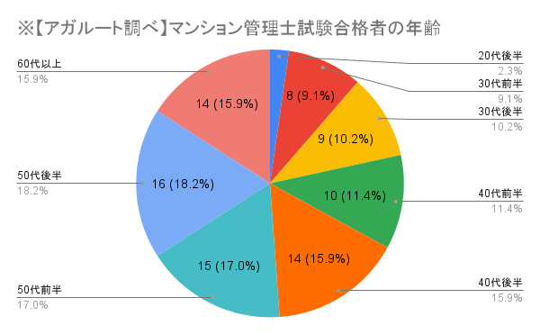 これは、マンション管理士の仕事が知識のみならず人生経験を活かした仕事も必要としている部分があるため比較的歳を重ねて受験し、合格している方が多いと推察されます。