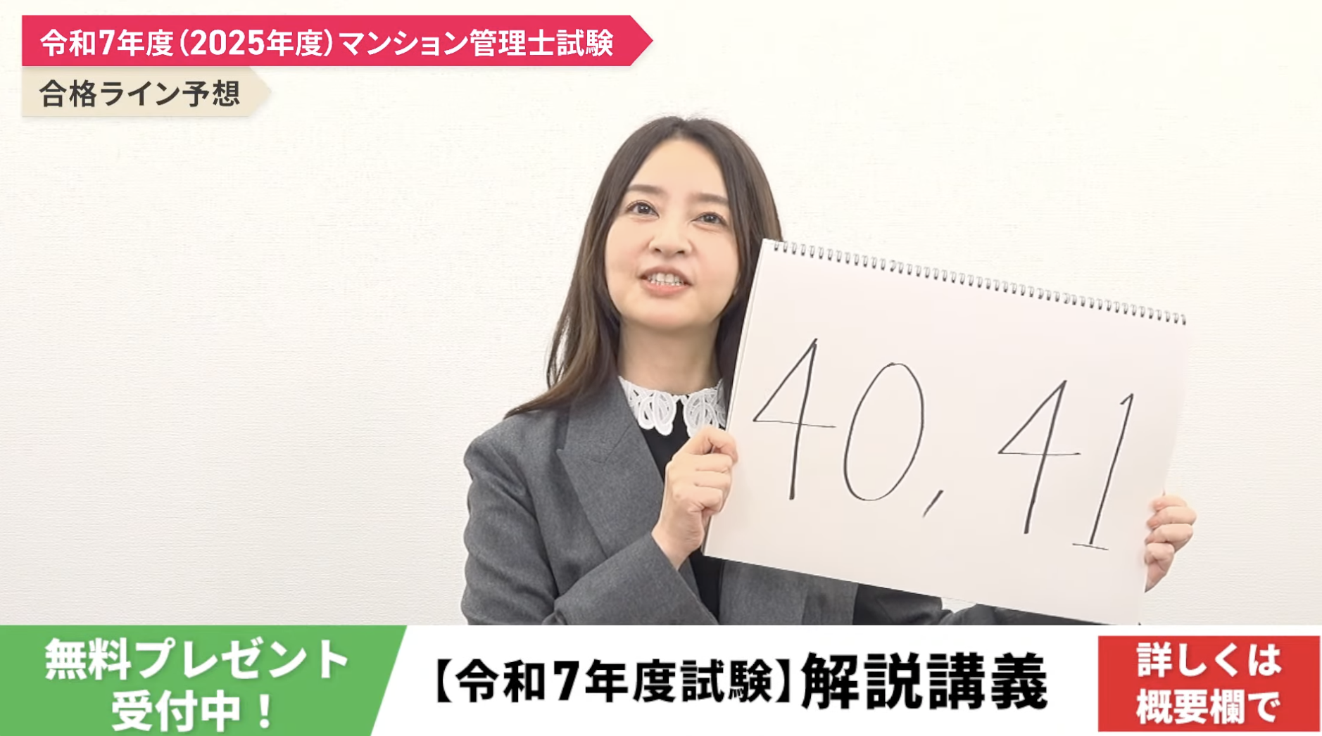 資格試験予備校アガルートアカデミーによると、令和7年(2025年)の管理業務主任者試験の合格点予想は40~41点でした。