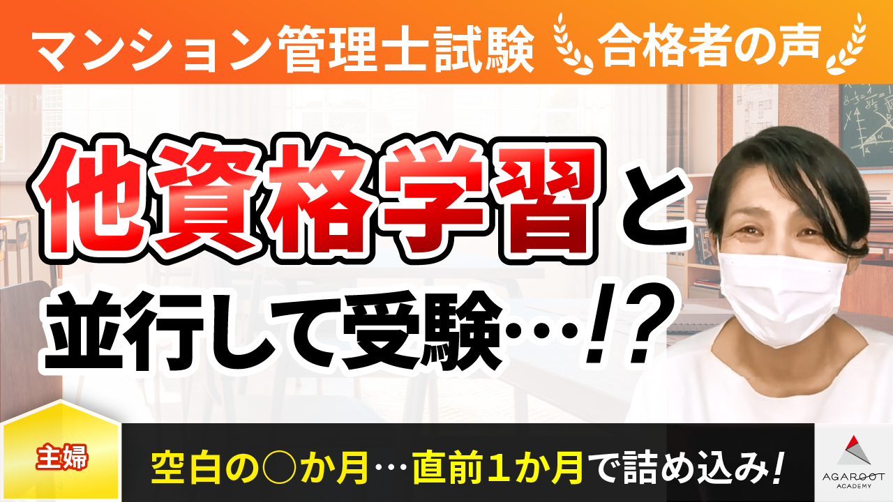 他資格と平行しながら途切れ途切れに講義を受けて問題を一度ザッと解いて以降、4ヶ月程マンション管理士のテキストを一度もひらけなかったので、残り1ヶ月ちょいで再学習をを始める時は不安でたまりませんでした。知人に悩むのは暇な証拠との言葉を頂き、全力で取り組めました。