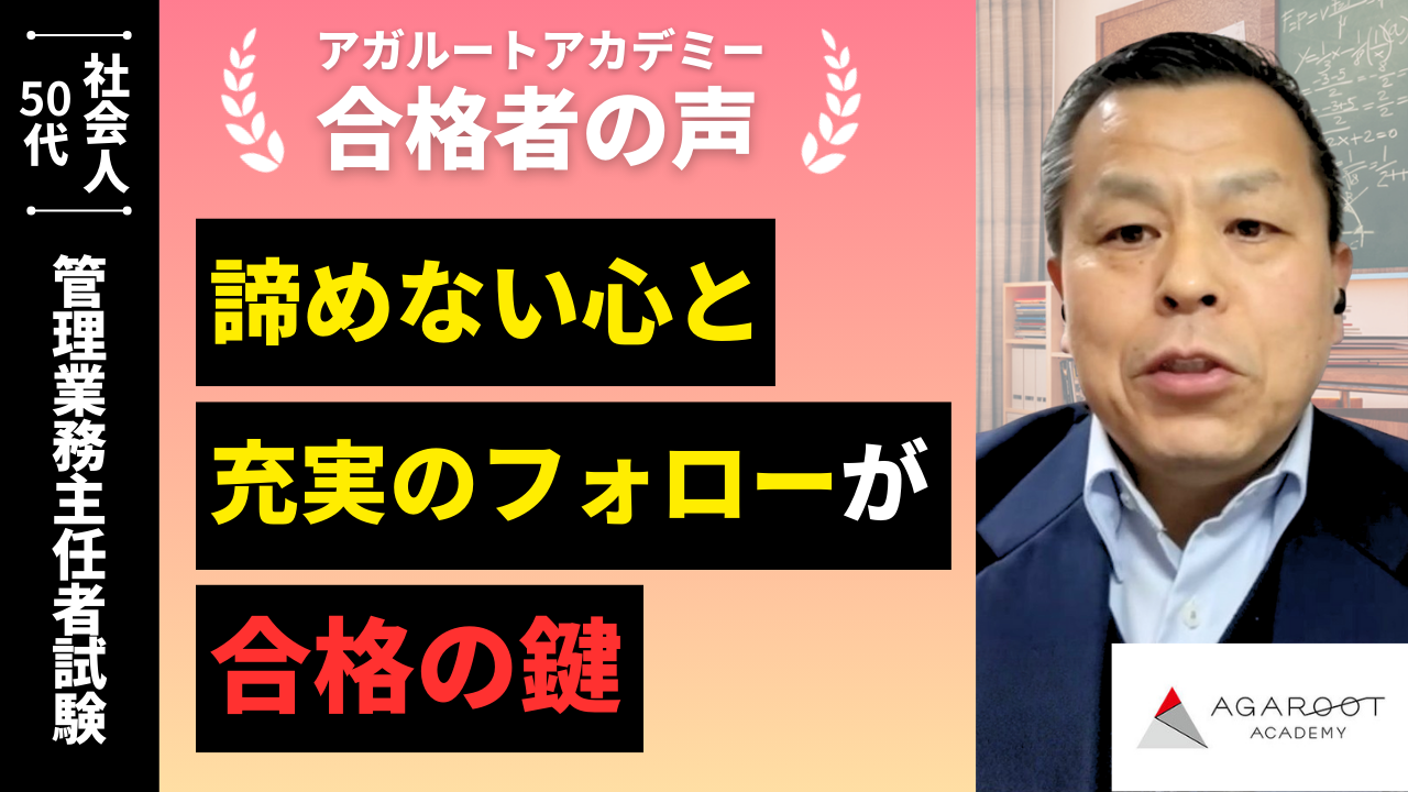 いままでに経験のない業種であり、知識もなかったため、試験合格の為、[最短ルートアガルート]のCMを見て興味を持ち、他の通信教育サンプル動画との比較して、自分に合いそうなアガルートを選択しました。