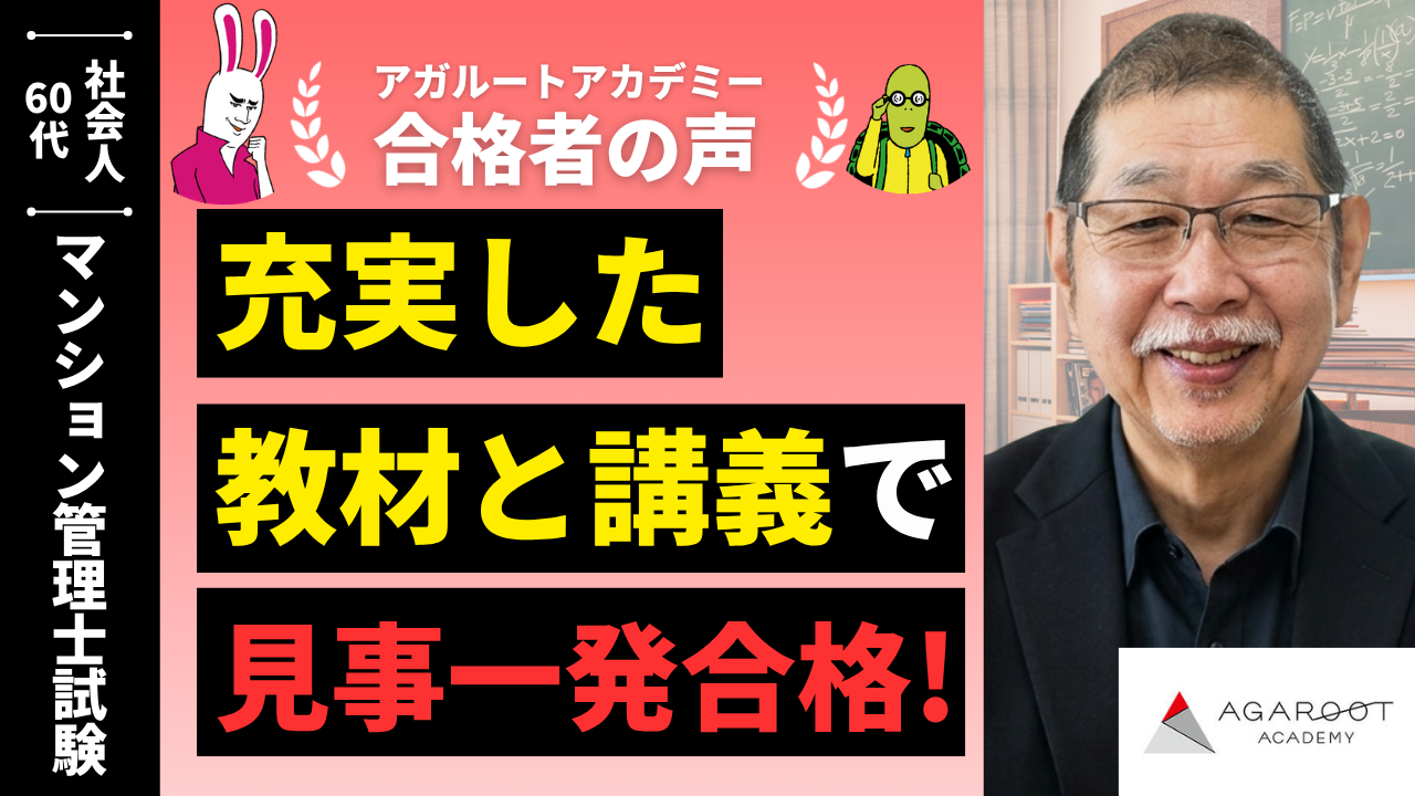 令和6年度の管理業務主任者試験にアガルートの講座を利用して合格しました。 管理業務主任者試験の合格により5問免除適用によりマンション管理士試験を受験でき、かつ令和8年度からは区分所有法の大改正が入りますので、令和6年度時点の法律知識で受験できるのが今年までだったため受験をしようと思いました。