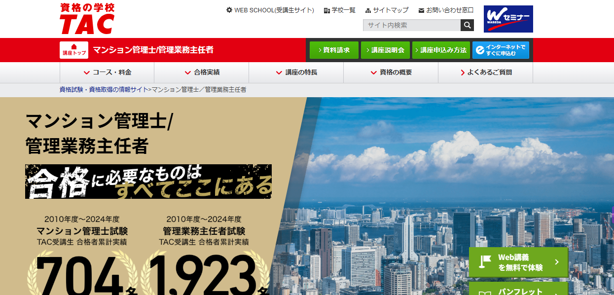 | TAC | 132,000円~ | ・マンション管理士本科生 ・W合格本科生 | ・開講時期や学習レベルに最適なコースを選択可能 ・短期合格へ無駄なことをしないカリキュラムの実現 | ・通学は直接質問可能 ・通信はメールで質問可能 ・自習室を利用できる |