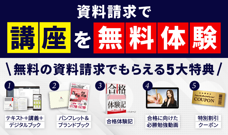 資料請求をしていただいた方に、アガルートの無料体験講座をプレゼントしています。是非お試しください。