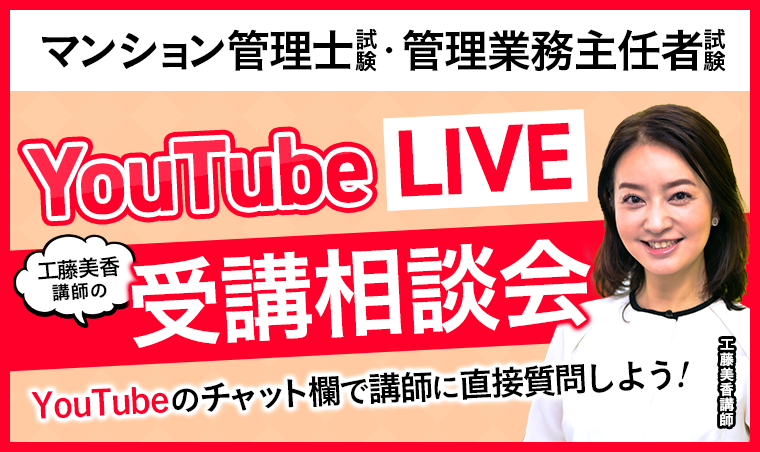HOME > マンション管理士試験・管理業務主任者試験 > マンション管理士試験・管理業務主任者試験| 工藤美香講師のYouTubeLIVE受講相談会