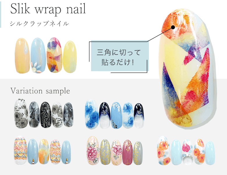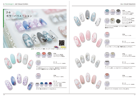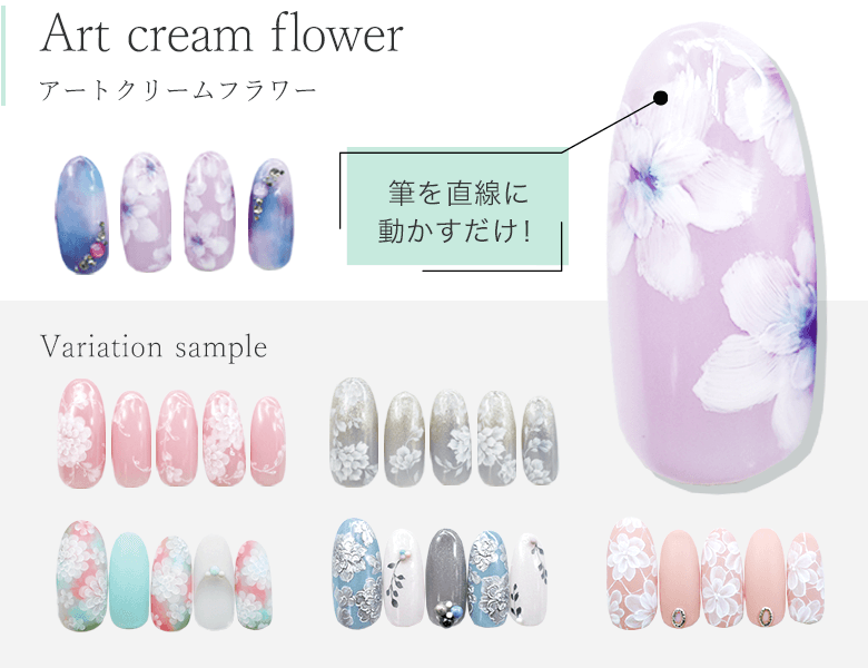 - アートクリームを使って直線を引くだけで花を描くテクニックと、爪を補強するためのシルクラップを使ってオリジナルのシールを作るテクニック、合わせて2つを紹介します。また、それぞれのテクニックで7種類のバリエーションをご紹介します。色やトップコート、筆の動かし方などを変えて、さまざまな雰囲気のアートを作ってみましょう。