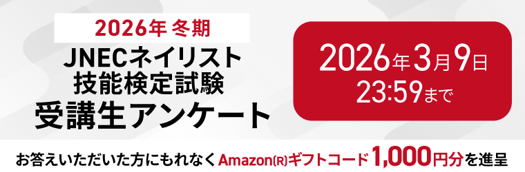 ・JNECネイリスト技能検定試験有料講座を受講されていない場合、また2025年秋期検定試験2級・3級に受験申込をされていない場合は本アンケートの対象外になります。Amazon(R)ギフトコードの進呈はございませんので、予めご了承ください。