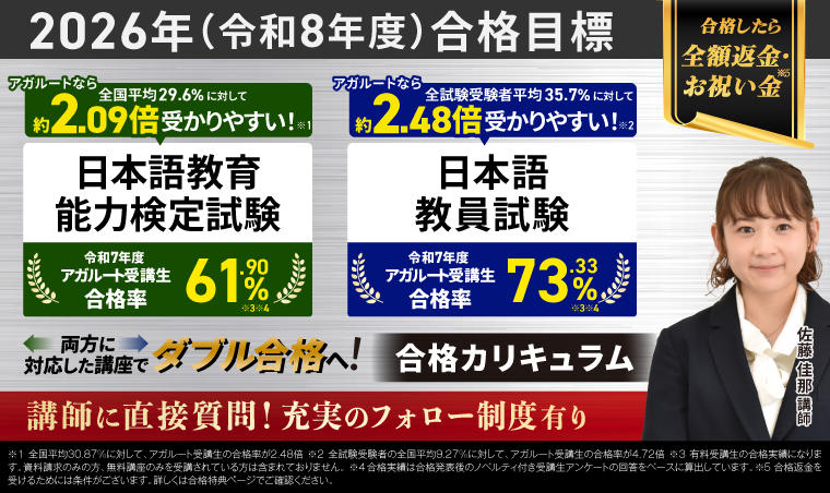 アガルートアカデミーなら、日本語教員試験・日本語教育能力検定試験の最短合格が目指せます。