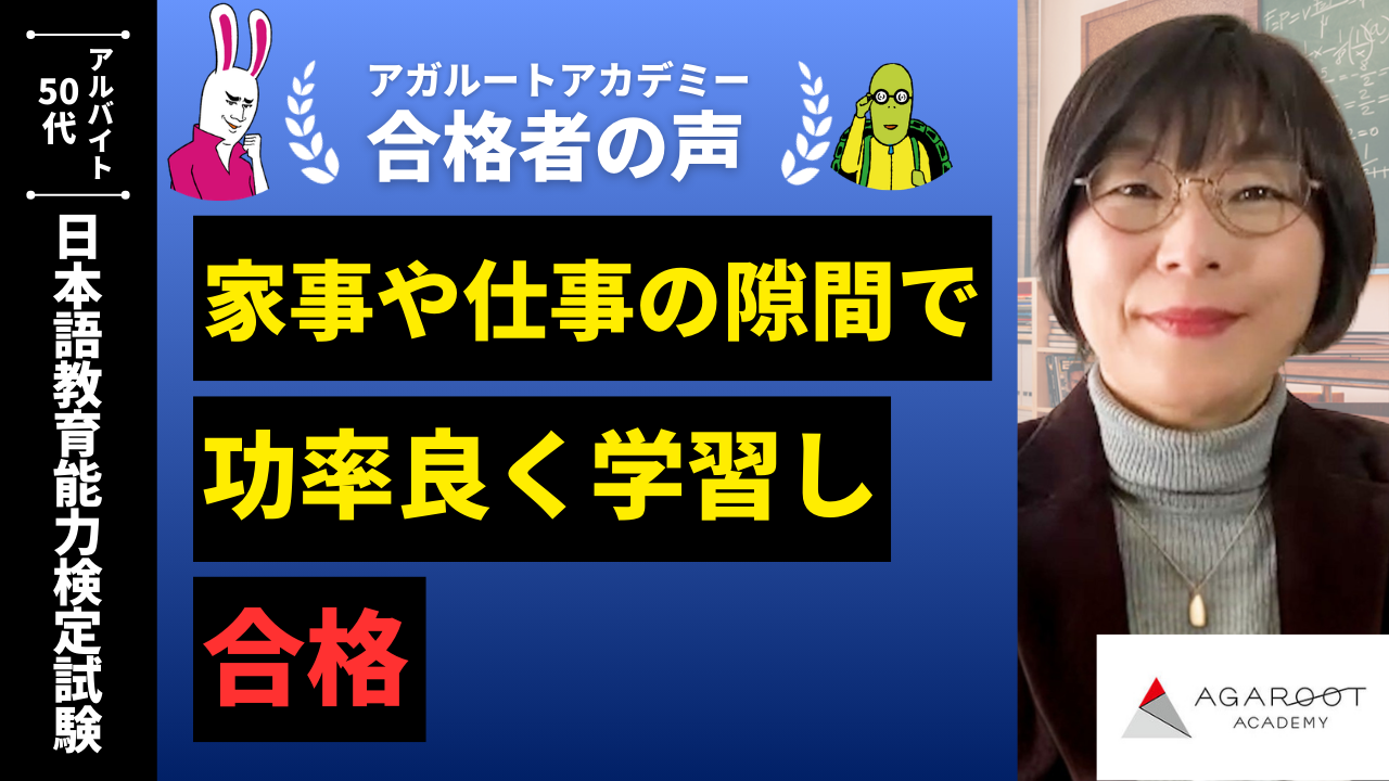 私は1月の終わりぐらいから学習をスタートしたのでやや出遅れたと感じていました。しかしはじめに講師の佐藤先生のアドバイスにしたがって試験までのスケジューリングをしたところ、まだ余裕があると気づくことができ安心してスタートできました。すぐに仕事に活かせそうな部分から学習を始めることで、興味がわき楽しく勉強に取りかかれました。動画は要点をノートにまとめながら視聴し、自分なりに整理するようにしました。記憶力をあげるには座学ばかりでなく体を動かしながら学ぶほうが良いと学んだことがあるので、散歩や家事をする時に、すでにノートにまとめ終わった部分の音声を聞くようにしました。そうすると、歩いていた場所や景色と聞いた内容が結びつき、記憶が強化されました。アガルートのWebサイトのおすすめにあった「日本語教育能力検定試験 例題集」というアプリもスキマ時間で何度もやっていました。ゲーム感覚で繰り返すことで知識を増やせたと思います。