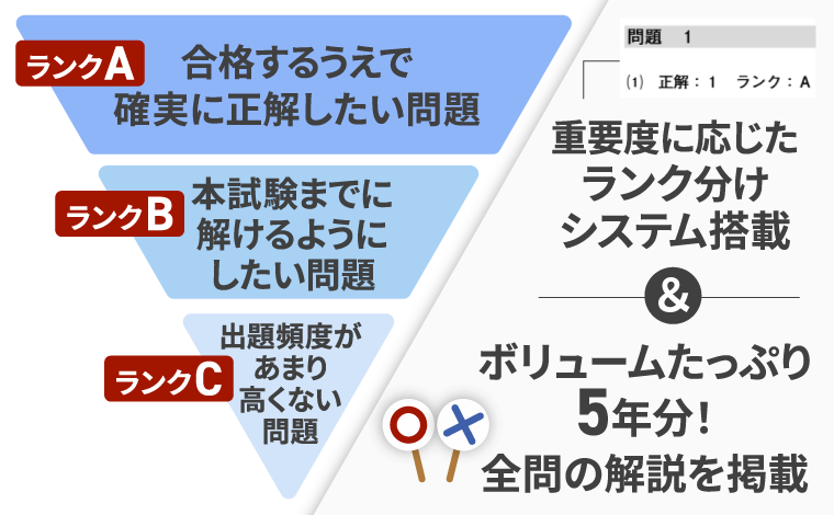 直近5年度分の全問の解説を掲載しています。確実に正解したい問題から出題頻度が高くない問題まで3段階にランク付けすることで、合格のために落としたくない問題がわかりやすく構成されています。