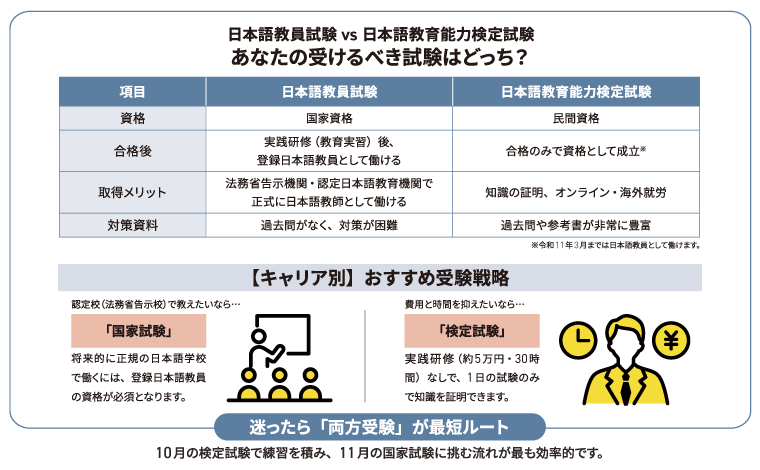 日本語教員試験と日本語教育能力検定試験は、国家資格と民間資格の違いがありますが、どちらか一方だけでなく2つの試験に合格することで、就職活動で有利になることが見込まれます。