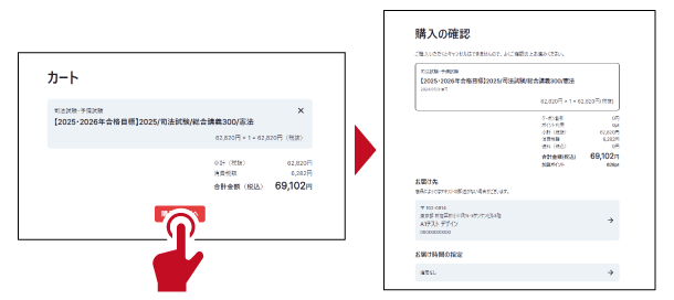 お申込み講座や送付先の住所に間違い等がないことを確認していただき、手順を進めます。