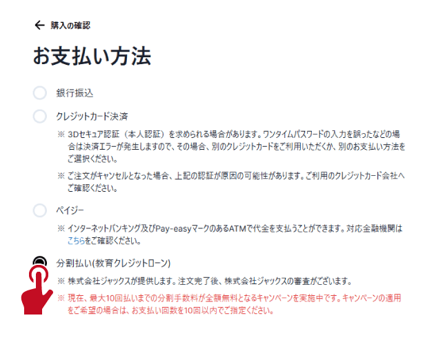 - ※最大10回払いまでの分割手数料が全額無料になります。ご希望の方はお支払い回数を10回以内でご指定ください。
