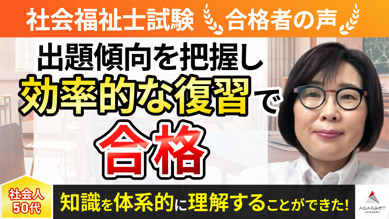 講座動画で講師の方が丁寧な説明で講座動画時間も細かく、隙間時間でも学習を進めることができ集中力が持続できました。参考書も大きすぎないサイズで勉強場所を選ばず持ち運びに良かったと思います。夏ぐらいから総合講座の動画視聴し、マーカーを引き、科目ごとに読み終わると基礎問題を解きました。仕事と家事で時間がとれず途中で心が折れそうになりましたが、アガルート講座を信じて取り組みました。基礎問題習得講座はやり遂げれば、必ず力になると思います。基礎問題学習講座を1日1科目と決めて問題文を解き、答え合わせをして学習した知識を固める作業は苦痛と言える作業でしたが、確かな学習知識となり国家試験での結果に繋がると思います。私が本格的に勉強を開始したのは、12月頃で1日2時間以上、休みの日はそれ以上学習しました。分野においても全ての分野を網羅するために毎日スケジュールをしっかり立てて、その通りにすべての分野を満遍なく勉強することを心がけました。アガルートの問題集は、過去問と基礎問題を3回以上解きました。移動中は、社会福祉士関係の動画を聴くことを繰り返していました。勉強が好きではないので一度で終わらせようと思って一生懸命やった結果、合格できたと言えます。