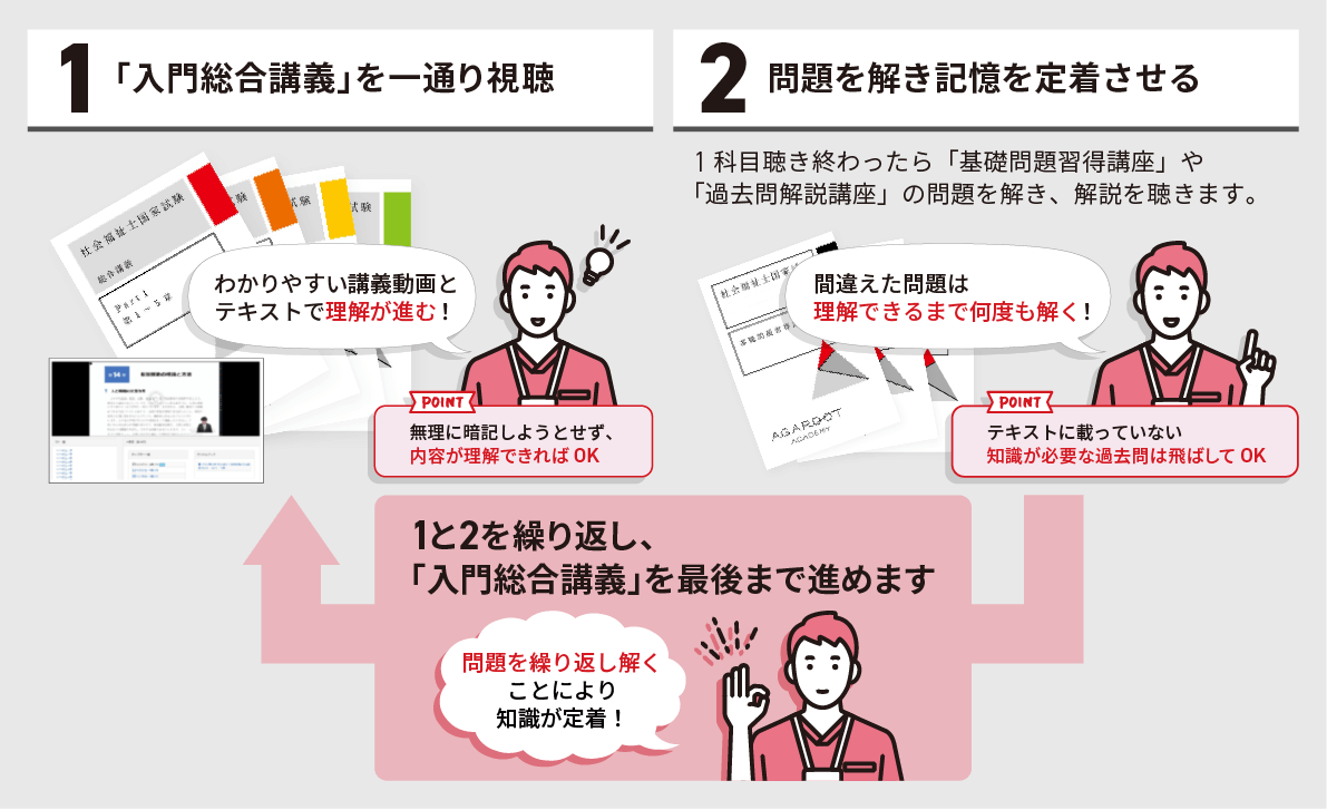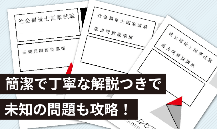 - 本カリキュラムでは、社会福祉士国家試験に合格するために必要な知識を効率よく丁寧にお伝えする「入門総合講義」や直近3年分の過去問を収録した「過去問解説講座」で知識のインプットと過去問演習が行えるほか、本試験に頻出の「基礎問題の対策」に特化した、基礎知識の定着(アウトプット)のための講座「基礎問題習得講座」で、重要な部分をピンポイントで学習・演習することができます。