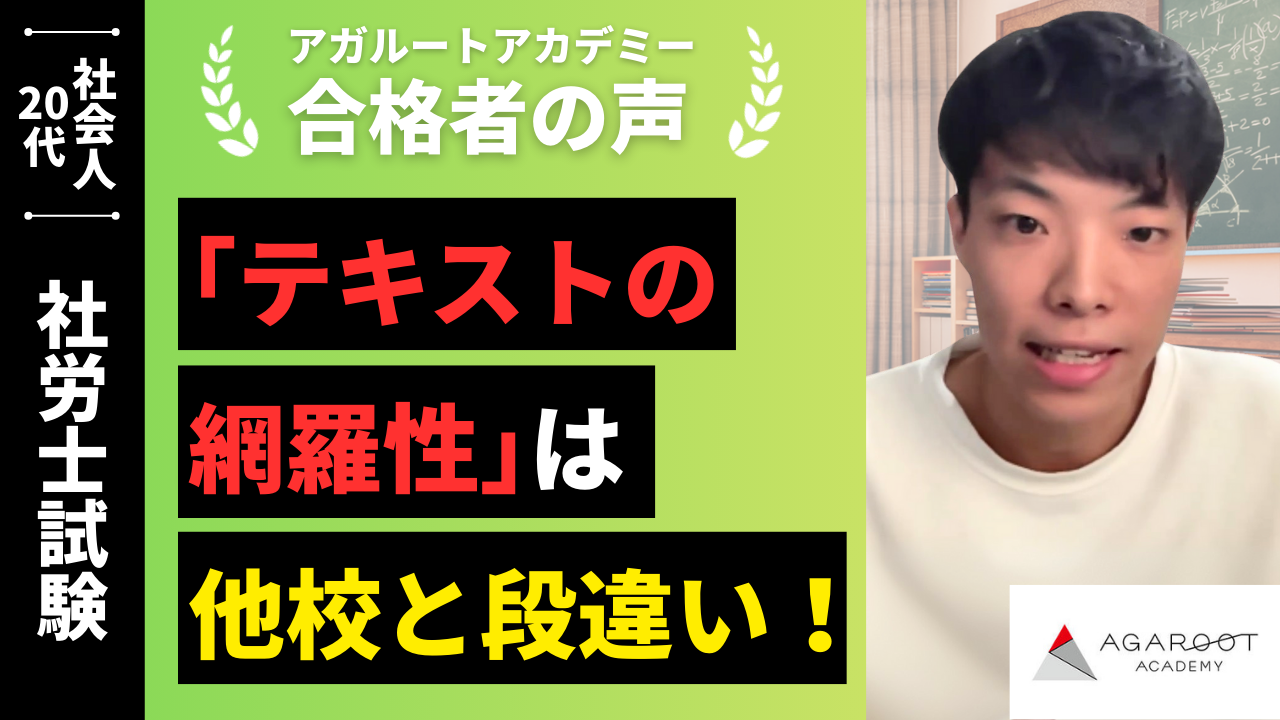 アガルートのテキストは網羅性が高く、大容量でありましたが、講師が一つ一つ分かりやすく解説しており、理解しやすかったです。