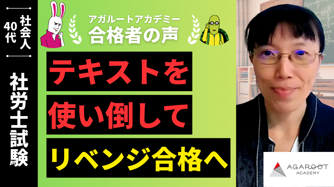 他予備校を利用していましたが本試験の得点が伸び悩んでおり、You Tubeの池田講師の投稿を目にして面白いと思い、テキストカバー率が高いと聞いたので、テキストをしっかり勉強できる予備校で頑張りたいと思いアガルートアカデミーを選択しました。