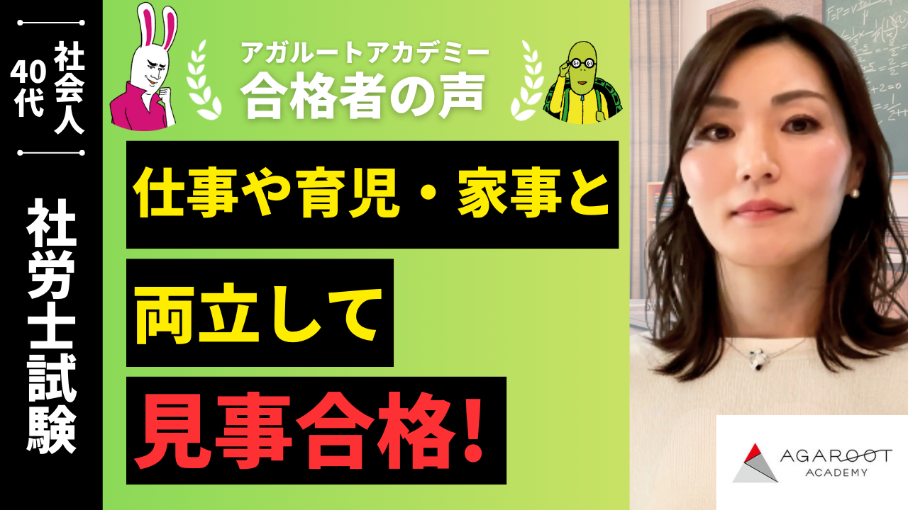 アガルートの講座を受ける前は別の通信講座を1年間受けていました。そちらの講座はテキストが法令メインで図解も少なく、テキストと併せて動画の解説をしっかり聞かないと理解が難しかったです。仕事、家事、育児と両立しながら確実に合格に近づくためにはもう少し効率的に勉強をする必要があると感じていました。アガルートの講座はサンプルテキストが分かりやすく、テキストだけで理解できる部分も多そうだったので受講を決めました。ホームルームと定期カウンセリングがあったのも魅力でした。