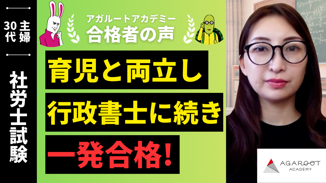行政書士をアガルートさんで一発合格して勉強のリズムを掴めたこともあり、何かもう一つ資格を取ろうと思った事から。 社労士は主人の仕事の関係で私が取ると都合が良かった事もあり、また行政書士試験を合格した事で受験資格ができた事もあり目指しました。