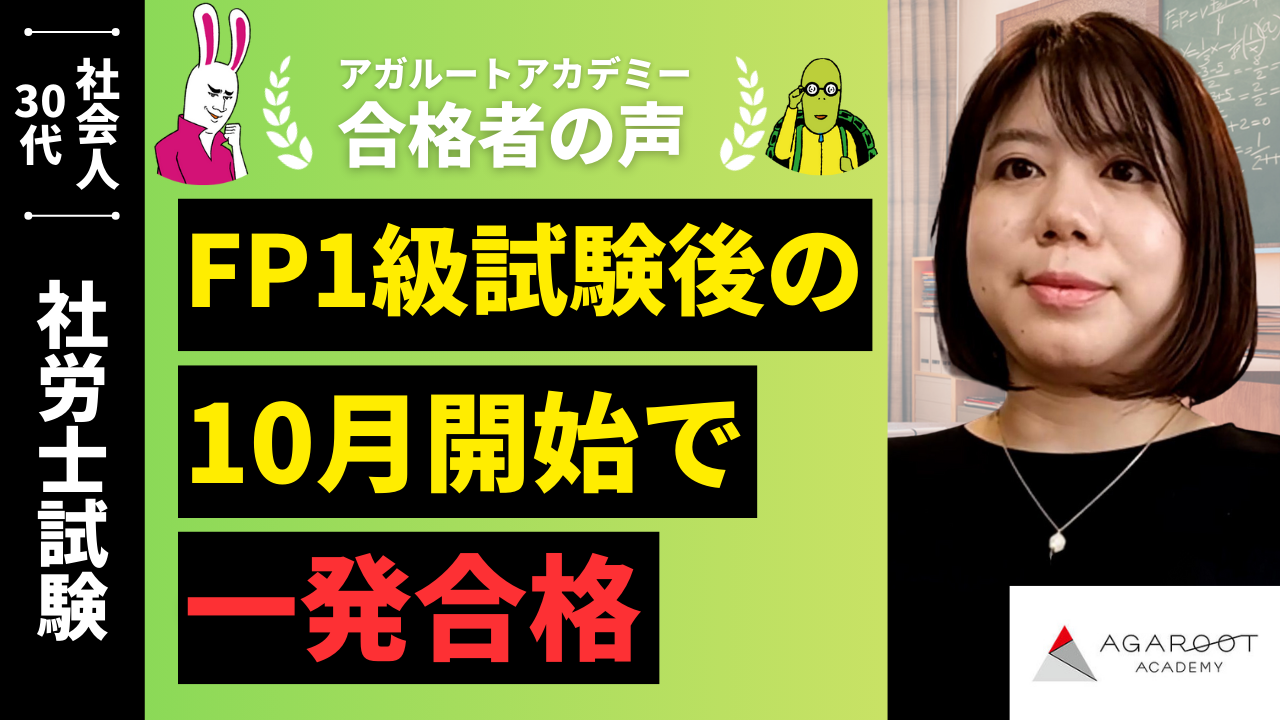 前年のFP1級実技の試験が一段落した10月から学習を開始しました。本試験までの期間が1年に満たないということで不安もありましたが、アガルートの合格体験記には自分よりも短い期間で一発合格された方がたくさんいらっしゃったので、私にも出来るはずと信じていました。 働きながらの勉強はFPの資格取得時から慣れていましたが、社労士試験の勉強はFPの何倍も奥深く、過去問を解いて慣らしていくという勉強方法は私には通用しませんでした。学習を始めた10月には既に総合講義が開始して1月くらい経過していましたが、遅れをとったら後からさらに焦ると思い、まずは総合講義のペースに追いつくことを目指していました。追いついてからはどんなに仕事が忙しい時期があったとしても、次の科目のテキストが揃うまでには講義の視聴と過去問2周はできるように調整していました。総合講義が良いペースメーカーになっていたと思います。