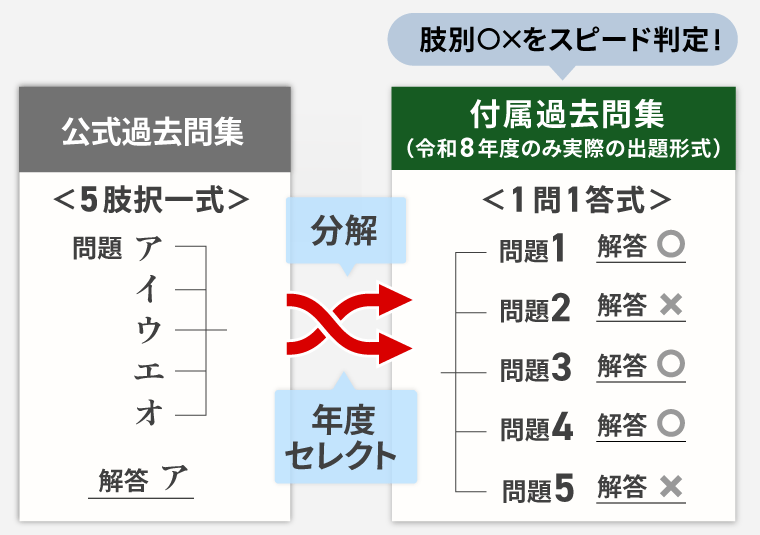 本カリキュラムでは、インプットだけでなく、アウトプットの質と量にも徹底的にこだわっています。本講座では、受験生が迷わず、かつ効率的に演習を繰り返せるよう、過去問を選択肢ごとにバラして、1問1答形式にした肢別問題集を9年分ご用意しております。選択肢の正誤を正確に判断する力を養い、あやふやな知識を徹底的に排除し、本試験で惑わされない「確かな判断力」が身につきます。