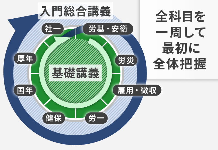 基礎講義で試験の全体像を俯瞰して確認したら、入門総合講義で基本的事項から応用事項まで社労士試験合格に必要な知識をインプットします。(2026年10月以降に学習を開始される方は入門総合講義からの受講をお勧めします。)