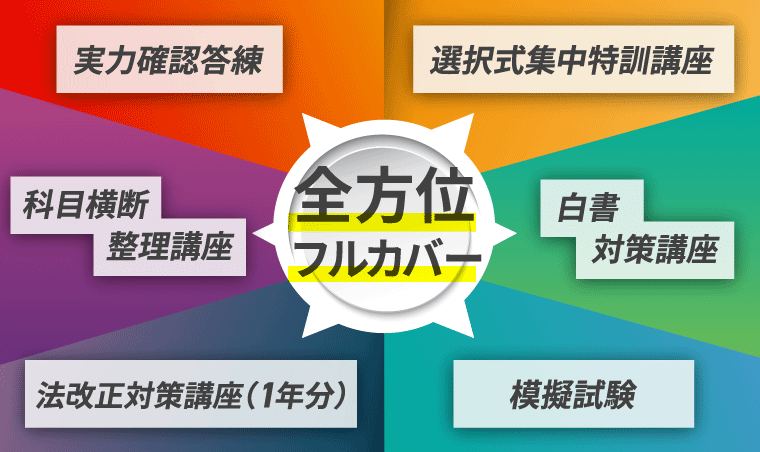 答練や過去問で自身の実力や弱点がわかったら、選択式集中特訓講座、科目横断整理講座、法改正対策講座(1年分)で知識の抜け漏れを補強していきます。