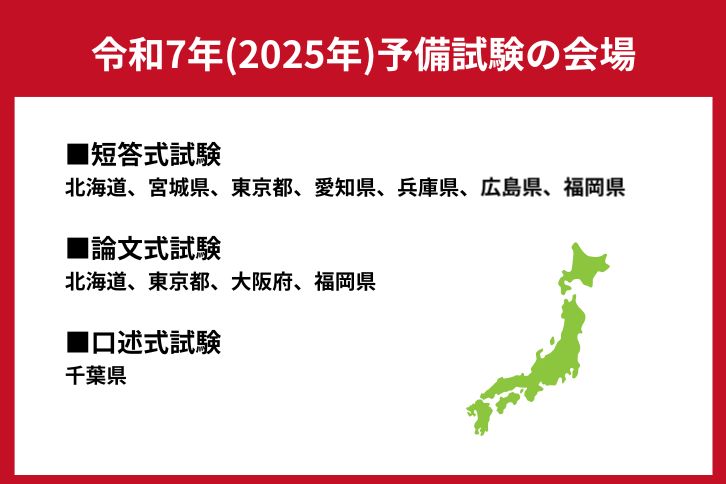 令和7年(2025年)予備試験の試験地は、短答式試験が北海道、宮城県、東京都、愛知県、兵庫県、広島県、福岡県。論文式試験が北海道、東京都、大阪府、福岡県。口述式試験は千葉県(法務省浦安総合センター)のみとなっています。